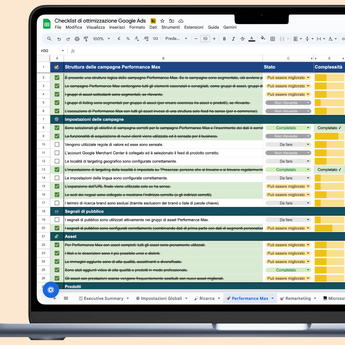 In 10 minuti individui errori, sprechi e priorità reali nel tuo account. Un Google Sheet duplicabile, pratico e senza teoria inutile.