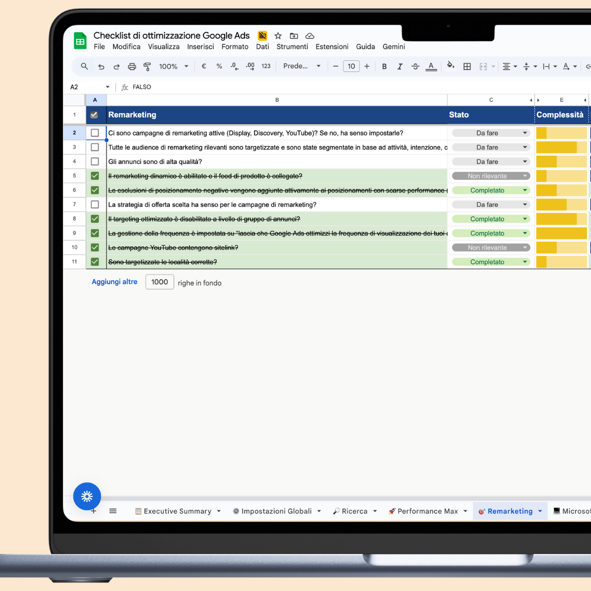 Avrai accesso immediato alla checklist che ti verrà consegnata via email. Puoi duplicarla e usarlo all’interno del tuo (o tuoi) account Google Ads.